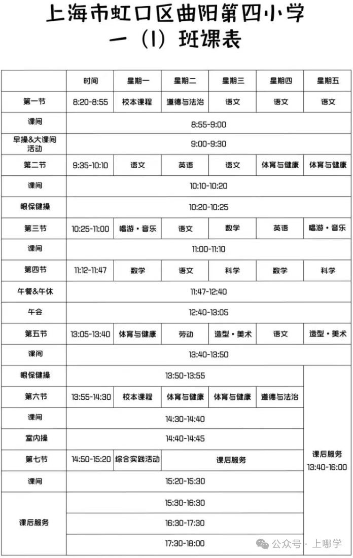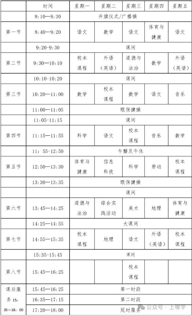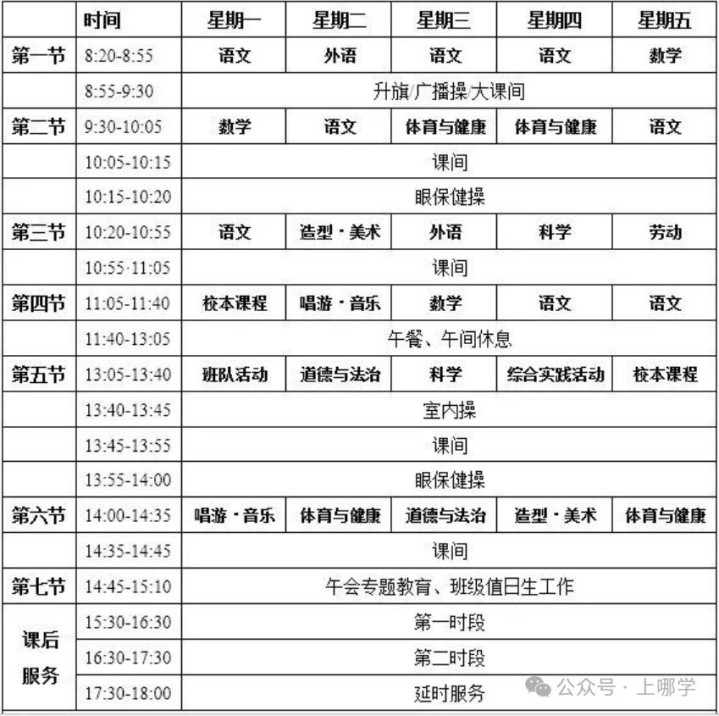 御桥小学发布2025年新生入学准备指南,表明学校的第一节课是8:20。根据今年春季学期课程表可以看出,学生每天要在8:20之前到校,下午15:10结束相关课程,三阶段课后服务可选择,课后服务时间最晚可到18:00。