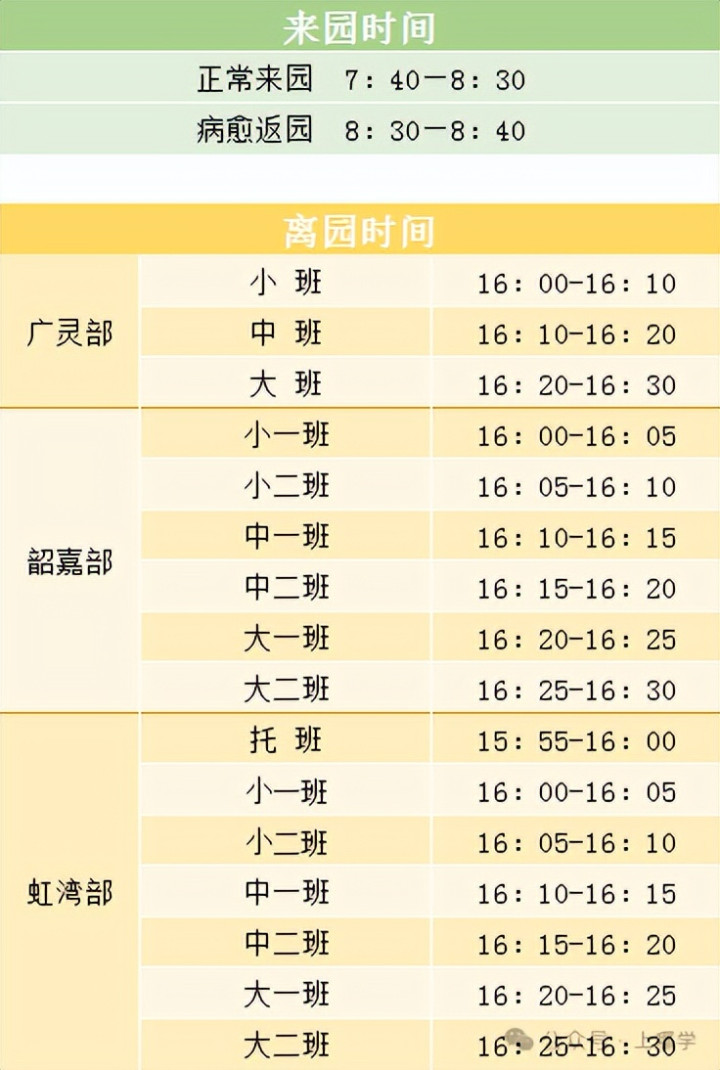 离园时间则是托班、小班16点,中班16点10分,大半16点20分。